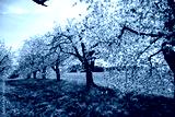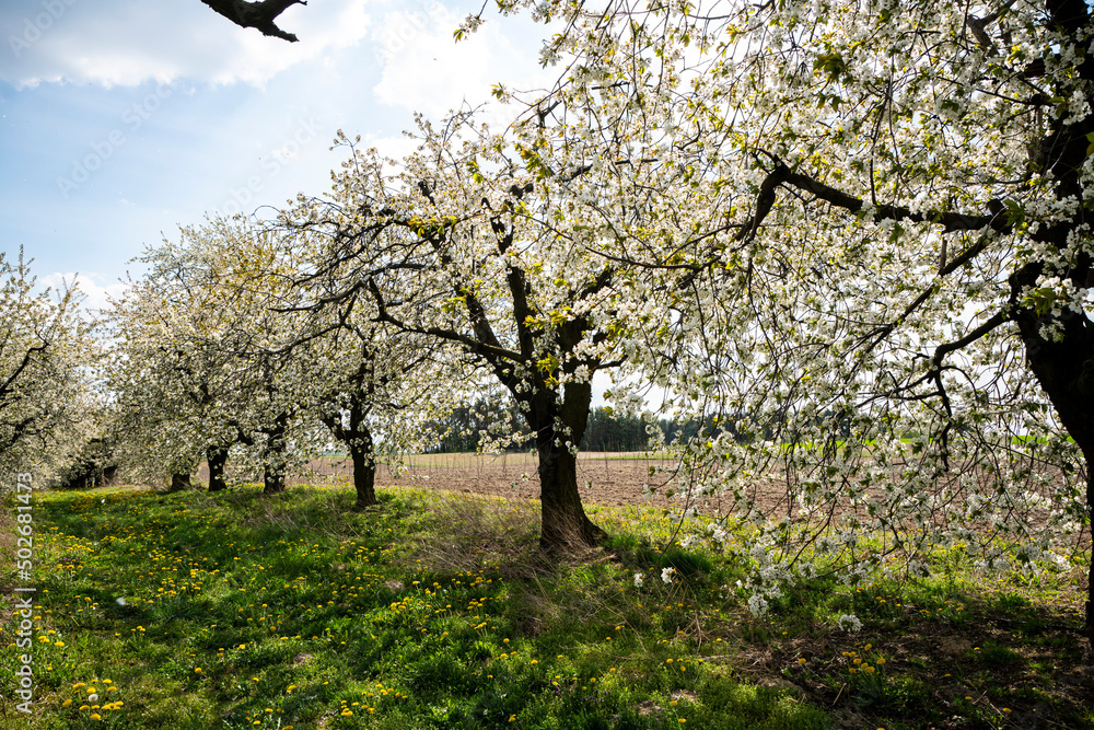 Sad czereśni, sad drzew owocowych, kwitnące czereśnie, kwitnący sad owocowy, drzewa owocowe
