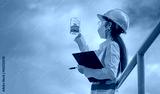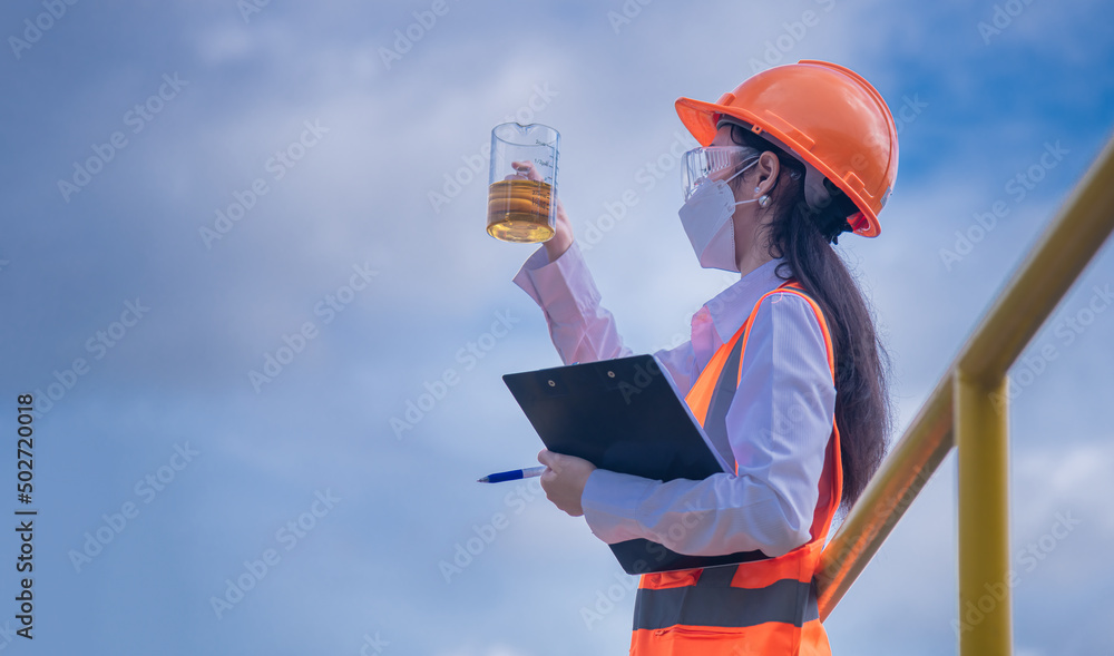 Worker under checking the waste water treatment pond industry large to control water support industry ,wearing mask for protect for virus and pollution.