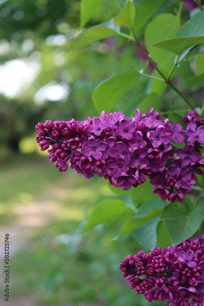 Close-up of Lilac blossoms and flowers on branch on springtime. Syringa vulgaris in bloom