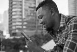 A Black businessman texts on cellphone during his coffee break on office balcony