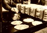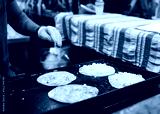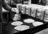 A man sprinkles cheese on a soft shell taco at a market - close up