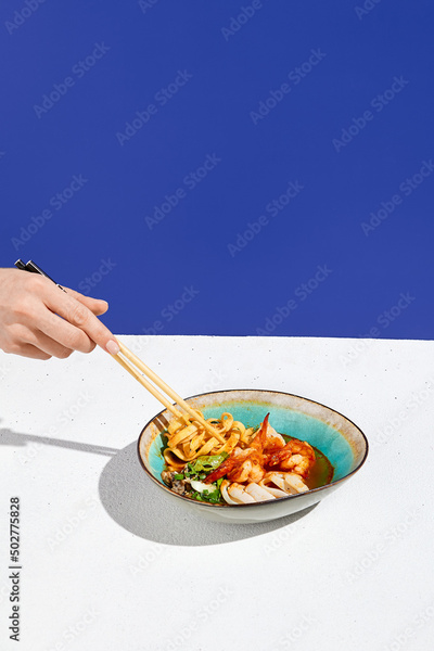 Traditional asian soup with seafood and udon noodle in ceramic bowl. Japanese soup with udon, shrimps. squid and mushrooms. Modern asian food on color background. Hand holding chopstick with noodle.