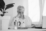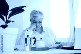 gray-haired businesswoman working at a desk with a computer