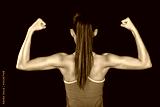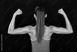 Strong fitness woman showing back biceps muscles