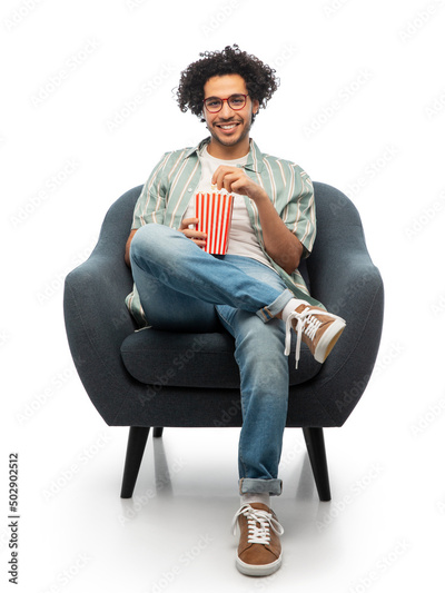 people and furniture concept - happy smiling young man in glasses with popcorn sitting in chair over white background