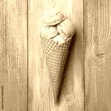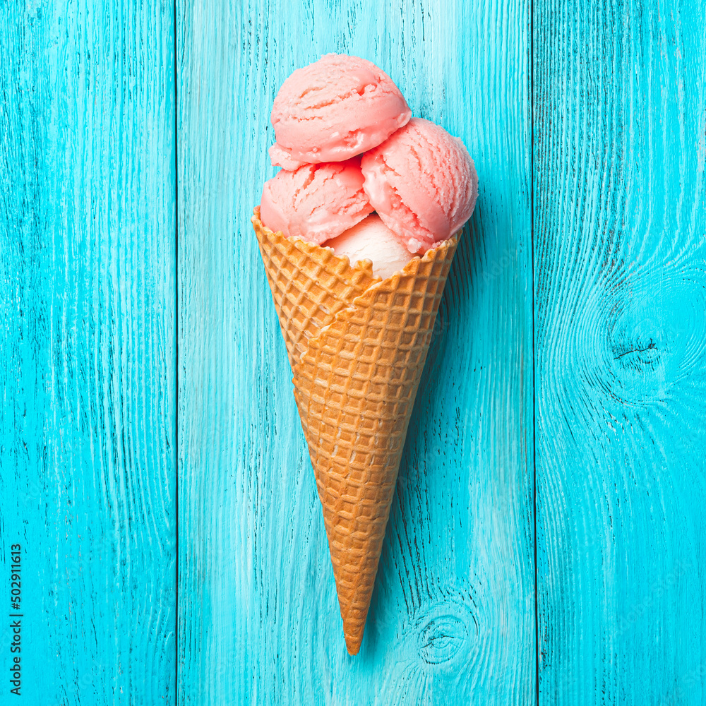Strawberry ice cream in a waffle cone on a blue background. Top view