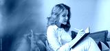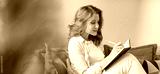 Beautiful young redhead woman siting on a couch thinking and writing notes.