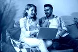 Young mixed race couple relaxing sitting on sofa and using laptop computer at home