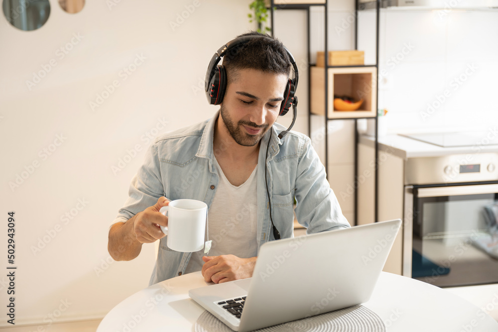 Portrait of bearded man wearing headphones with microphone drinking hot tea and using laptop at home.