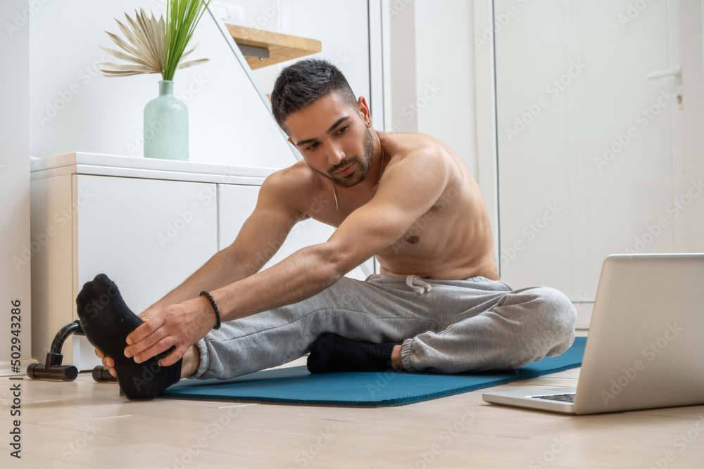 Young guy with average body type trying to improve his muscles, lose belly fat and lose weight on specific body parts while watching online workout courses and practicing on exercise mat at home.