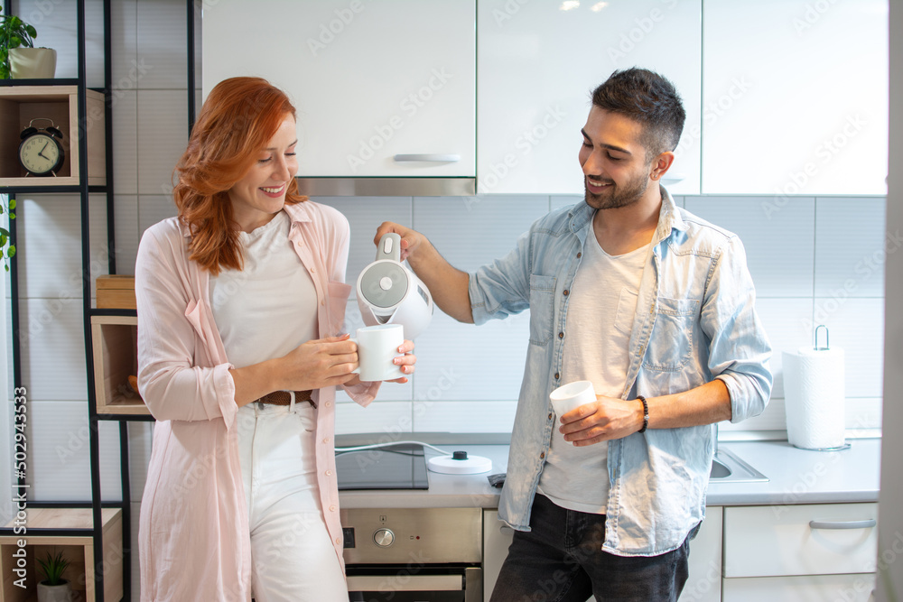 Handsome young man pouring hot water from electric kettle into his redhead girlfriend's cup in the kitchen.
