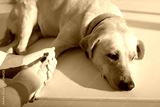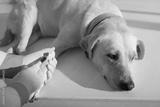 Sad dog waiting when doctor taking small blood samples from leg of labrador dog