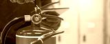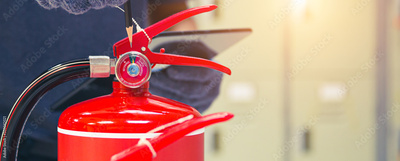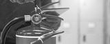 Fire extinguisher has engineer inspection checking pressure gauges of fire extinguishers to prepare fire equipment for protection prevent emergency and safety rescue and alarm system training concept.