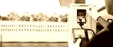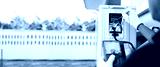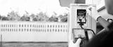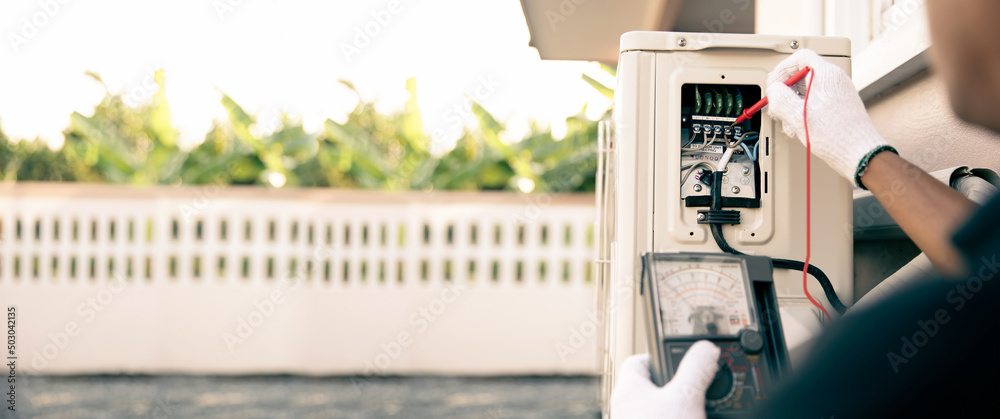 Technician Air-conditioning repairman using measuring equipment checking electric at circuit breaker on outdoor air compressor unit after install and check refrigerant system maintenance.