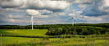 Panoramic shot of windmills on a green field and forest in the background under fluffy clouds