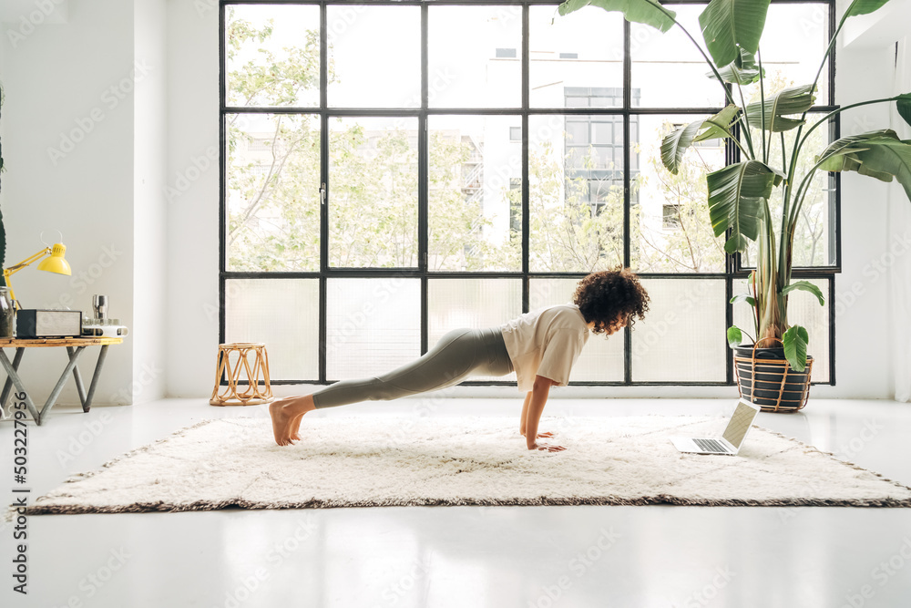 Young mixed race woman exercising at home doing plank pose using online video training with laptop. Copy space.