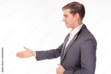 Handsome Business man shaking hands for greeting welcome business etiquette congratulation merger and acquisition Young manager or Boss shaking hands with a new employee Use for advertising