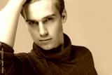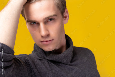 Closeup portrait of handsome man with yellow background at studio Sexy confident handsome guy looking at camera Attractive male slick his hair