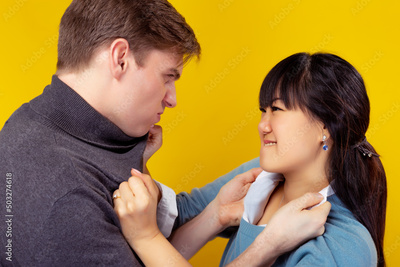 Couple misunderstanding and argument Young couple fights and yells at each other Husband and wife get angry and mad Asian woman and Caucasian man get frustrated Lover look at each other