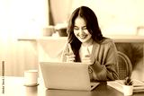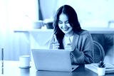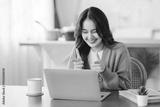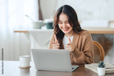 Happy positive young asian woman enjoying online communication at home, Female using wifi while video conferencing with friend, sitting in front of open laptop, smiling and waving hand, saying hi