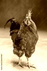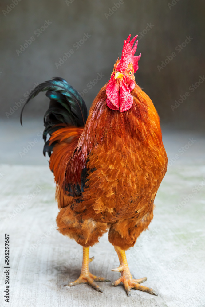 A beautiful rooster in front of a blurred background. Farm animal theme.
