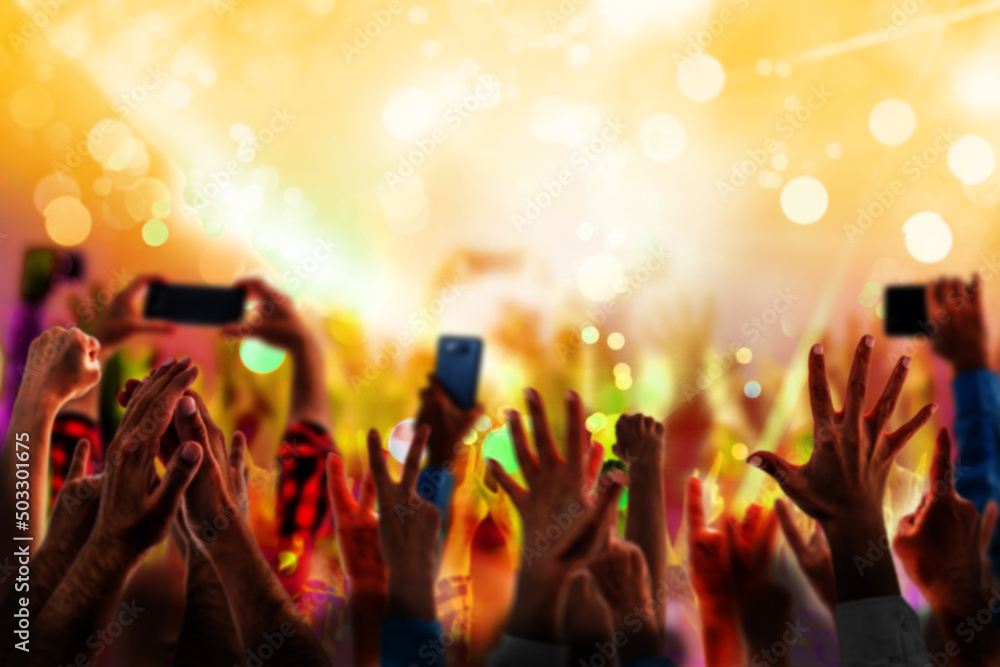 Crowd fans hand silhouettes at rock pop concert, party, event. Abstract blurred background. Many arms of people having fun