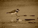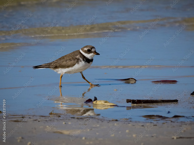 Young and adult common ringed plover or ringed plover (Charadrius hiaticula) in winter plumage.