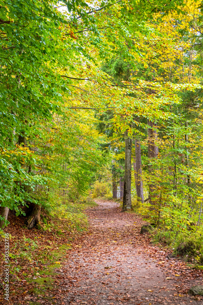 calm landscape with colorful deciduous trees in forest
