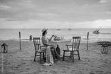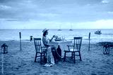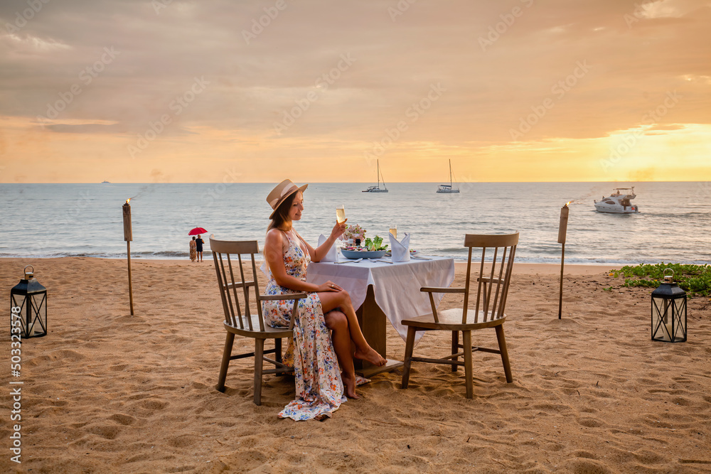 Romantic date on the sunset beach. Woman sitting alone on the table with gourmet food, drinking champagne from glass. Happy woman in luxury outdoor restaurant happy and smiling after proposal