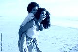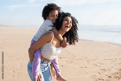 Contented mother and daughter spending time on beach. African American family walking, laughing, playing, riding on back. Leisure, family time, parenthood concept