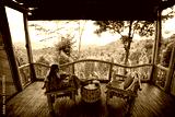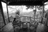 Young pretty tourist girl sit on veranda with mountains view and drink coconut. Enjoy vacation on Bali island