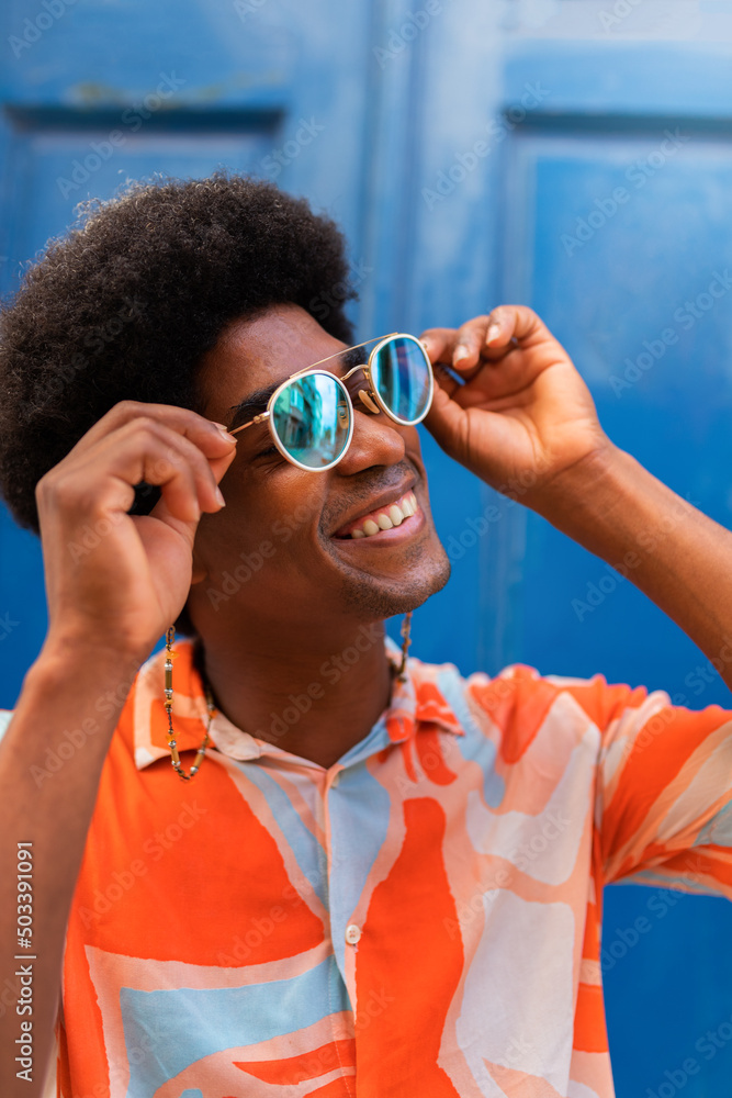 Vertical portrait of young happy black man putting on sunglasses outdoors.