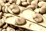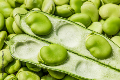 Both broad bean pods and shelled seeds. Healthy organic green raw broad beans.
