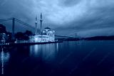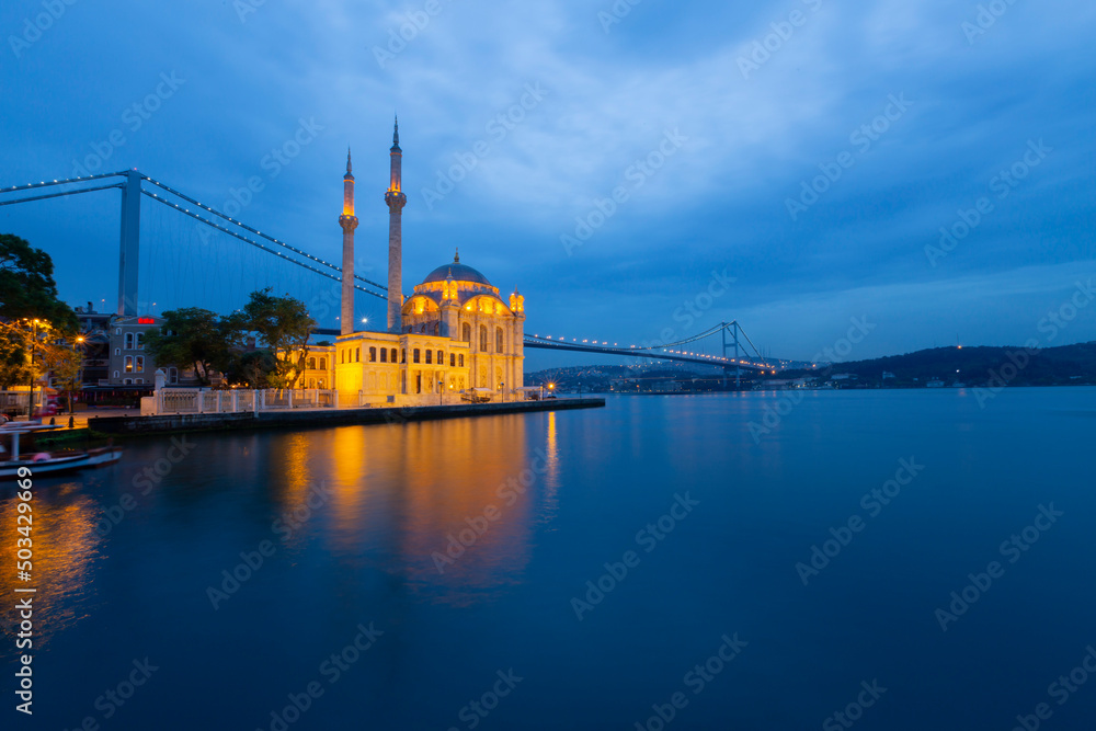 Istanbul. Image of Ortakoy Mosque with Bosphorus Bridge in Istanbul during beautiful sunrise.