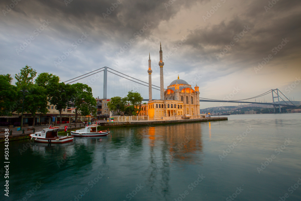Istanbul. Image of Ortakoy Mosque with Bosphorus Bridge in Istanbul during beautiful sunrise.