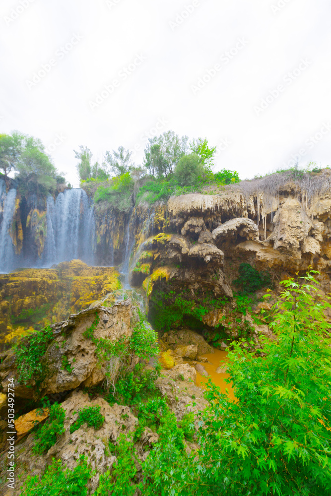 Yerkopru Waterfall and canyon on Goksu River is located in a small town named Hadim of Konya province in Eastern Mediterranean region of Turkey. Waterfall in nature wonder. View of the river. camp