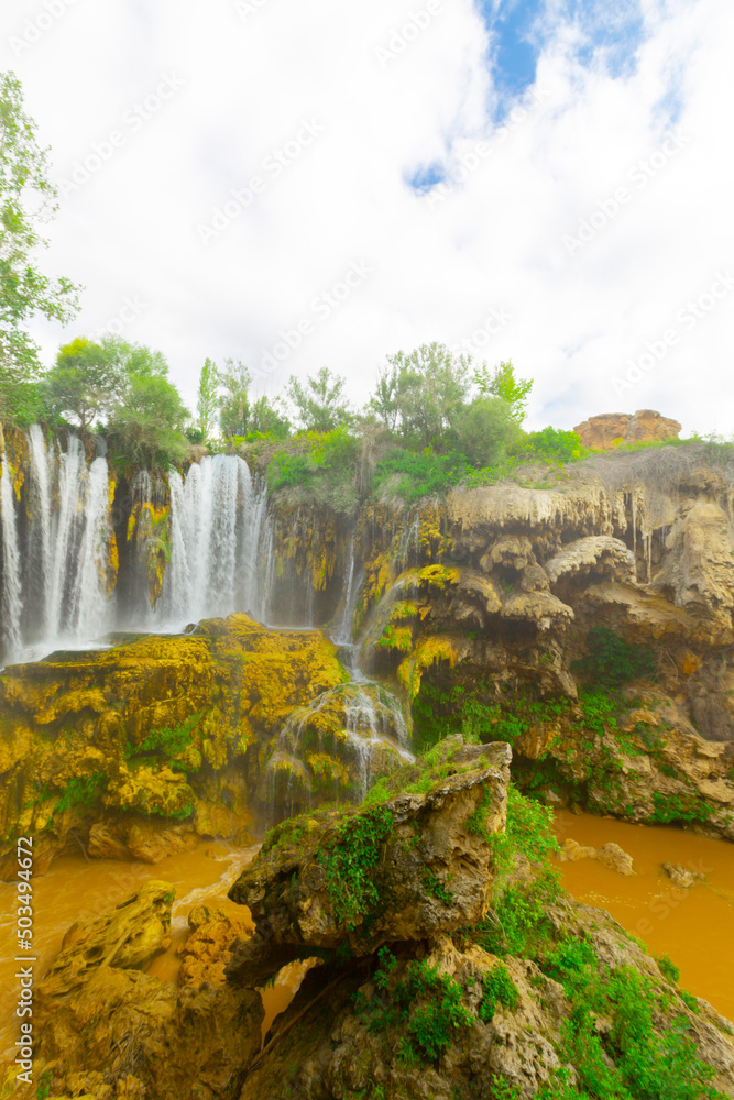Yerkopru Waterfall and canyon on Goksu River is located in a small town named Hadim of Konya province in Eastern Mediterranean region of Turkey. Waterfall in nature wonder. View of the river. camp