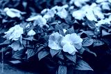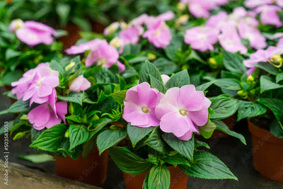 Purple impatiens hawkeri, the New Guinea impatiens in bloom in plant pots in the garden center. Ideas for gardening and planting in a new season. Selective focus, copy space