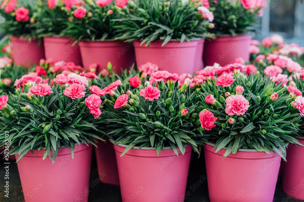 Fresh and young pink carnation flower in plant pots in the garden center. Ideas for gardening and planting in a new season. Selective focus, copy space