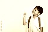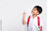 Asian toddler smiling happy wear student thai uniform red pants keeps pointing finger at copy space in studio shot isolated on white background, Portrait little children boy preschool, Back to school