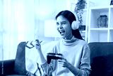 Excited Young Asian woman holding joysticks with playing online game with fists clenched celebrating victory expressing success to win.