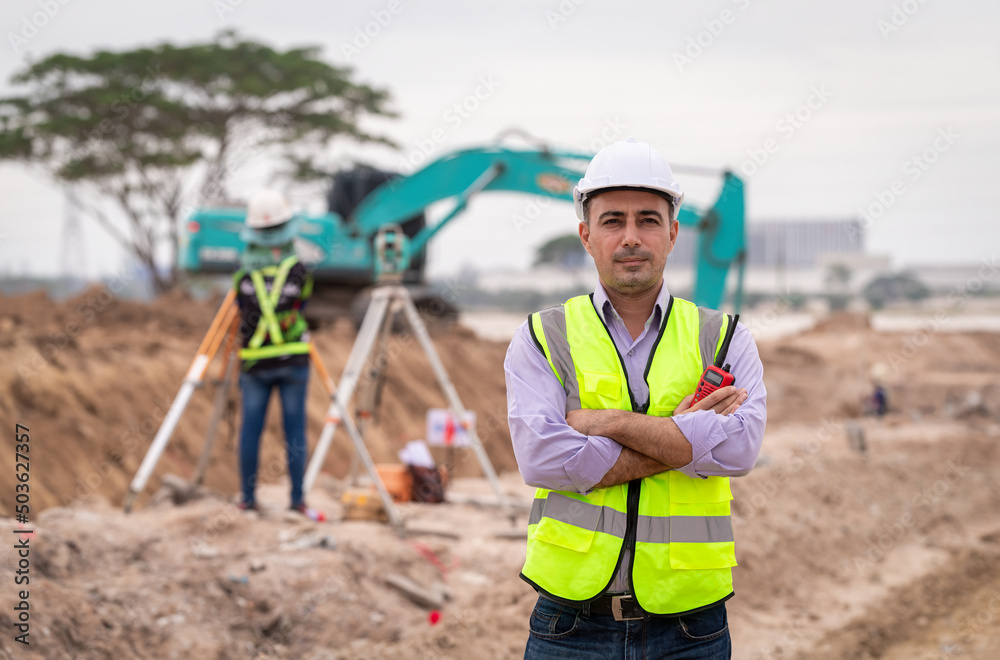 Surveyor engineer wearing safety uniform ,helmet and radio communication with equipment theodolite to measurement positioning on the construction site of the road with construct machinery background