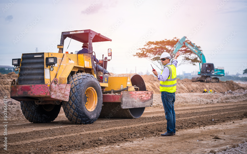 Surveyor engineer wearing safety uniform ,helmet and radio communication with equipment theodolite to measurement positioning on the construction site of the road with construct machinery background