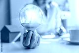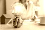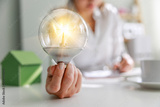 Businesswoman's hand holding a lightbulb on desk. Ideas, innovation inspiration concept