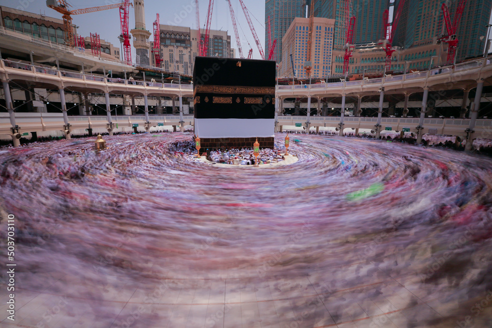 Mecca Saudi Arabia. Muslim people praying together at holy place.