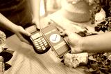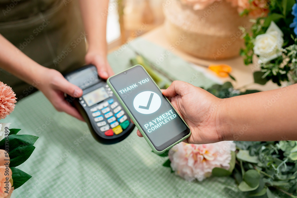Close up of easy payment by credit card or smartphone application Greenhouse workers selling pottered flowers.Contactless payment with credit card customer at counter using QR code contactless payment