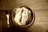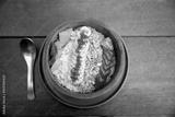 Mango smoothies bowl with berries, granola, chia seeds and coconut on concrete background