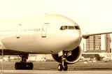 Passenger aircraft on the airport runway, against the backdrop of modern buildings city.