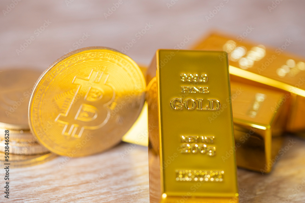 Bitcoin and Gold trading, gold bars on table background, pile of gold bars financial business economy concepts, wealth success in business and finance