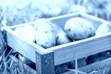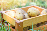 Fresh potato plant, harvest of ripe potatoes in wooden box agricultural products from potato field